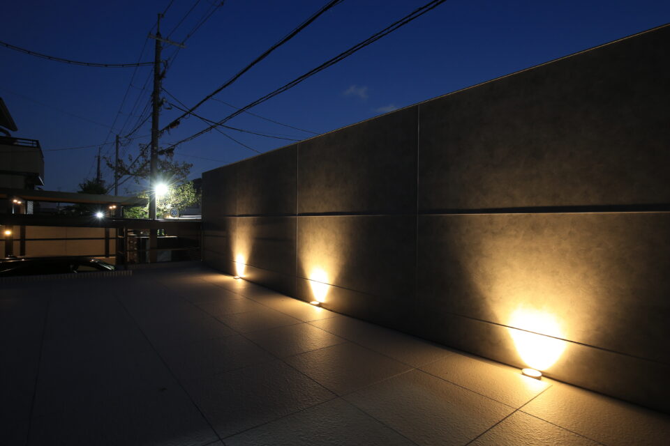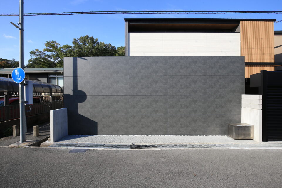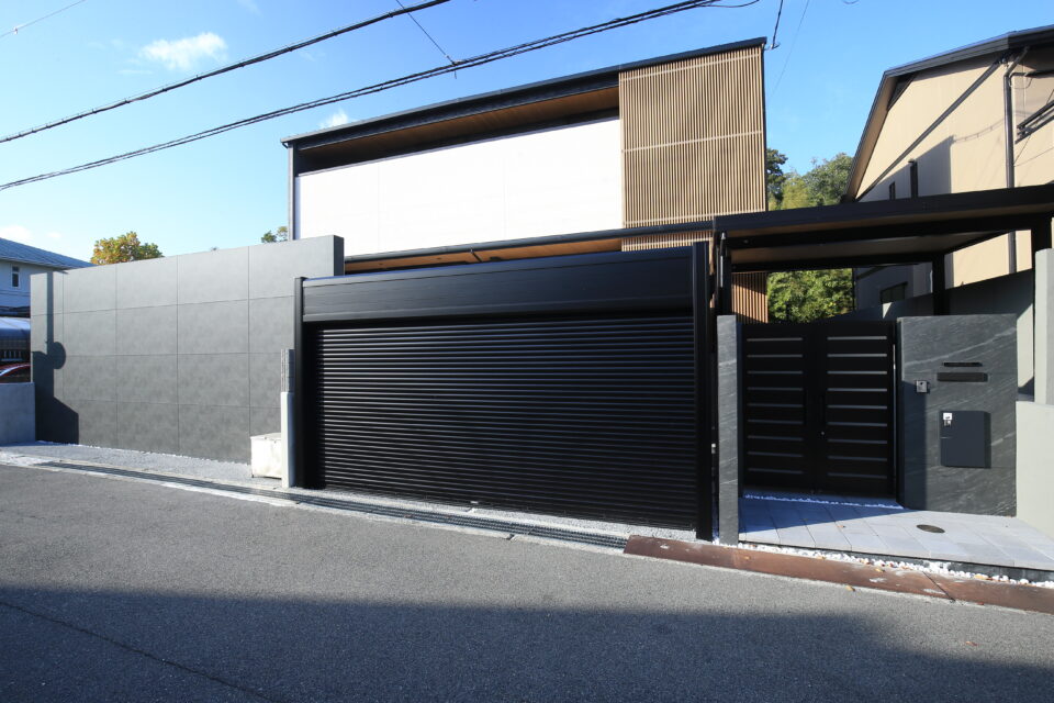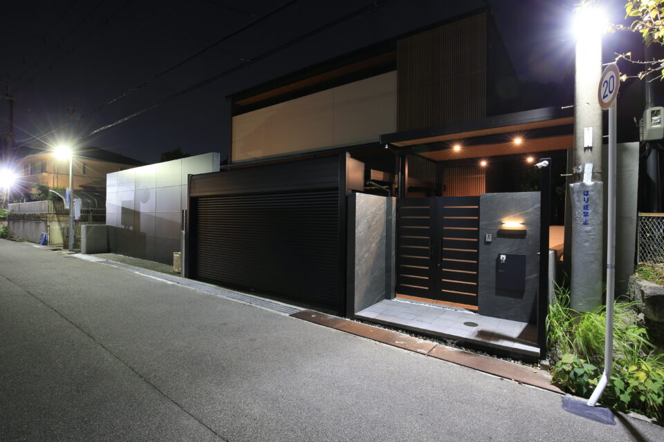 アプローチはブラックを基調とした重厚な門扉とタイル壁で構成し、植栽や照明と組み合わせることで、落ち着きと洗練を両立。