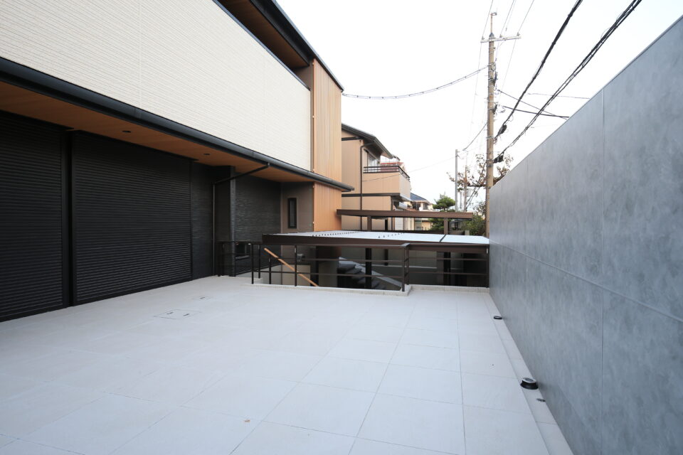 敷地内の大開口テラスは、明るいホワイトタイルで仕上げ、昼夜で表情が変わる贅沢な空間となっています。