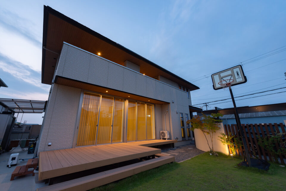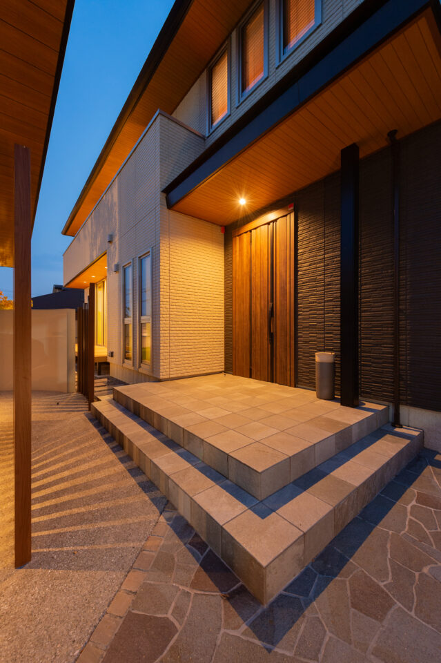 夕暮れ時、あたたかな室内の光と外構のライティングが重なり合い、住まい全体を幻想的に演出します。