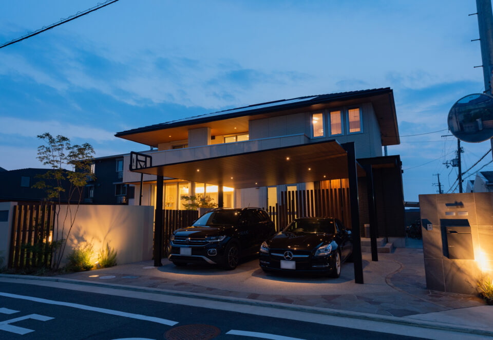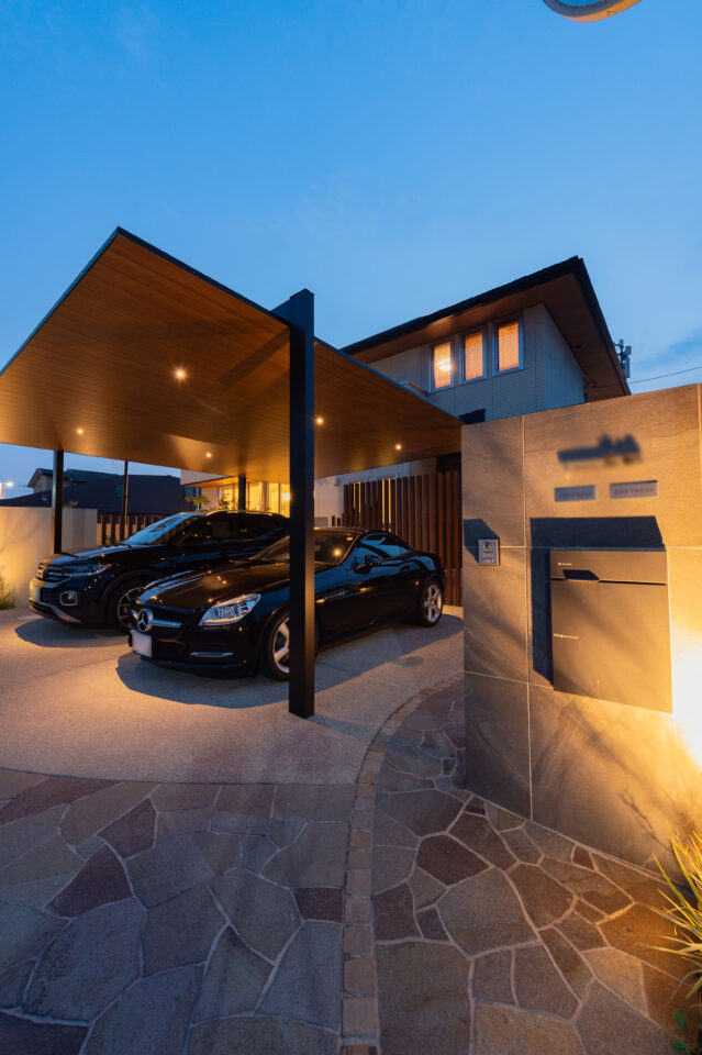 昼間は強い日差しや雨から車を守り、夜には照明と組み合わせることで、上質な雰囲気を演出します。