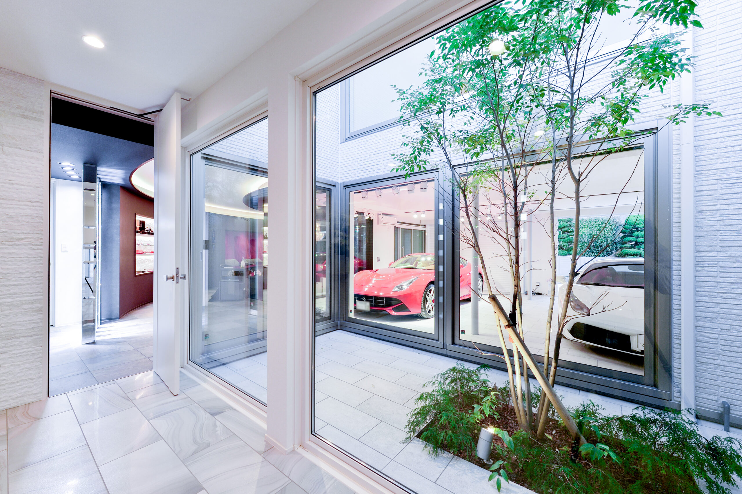 ガレージには愛車のフェラーリを2台収納し、室内からも眺められるよう大開口の窓を設計。