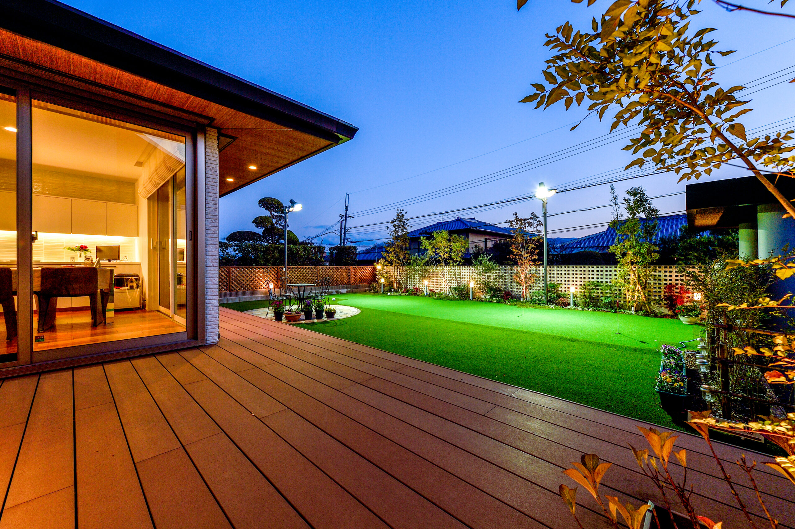 友人や仲間とお庭でケータリングパーティーを開くことができて、昼も夜も楽しめるアウトドアリビングに。