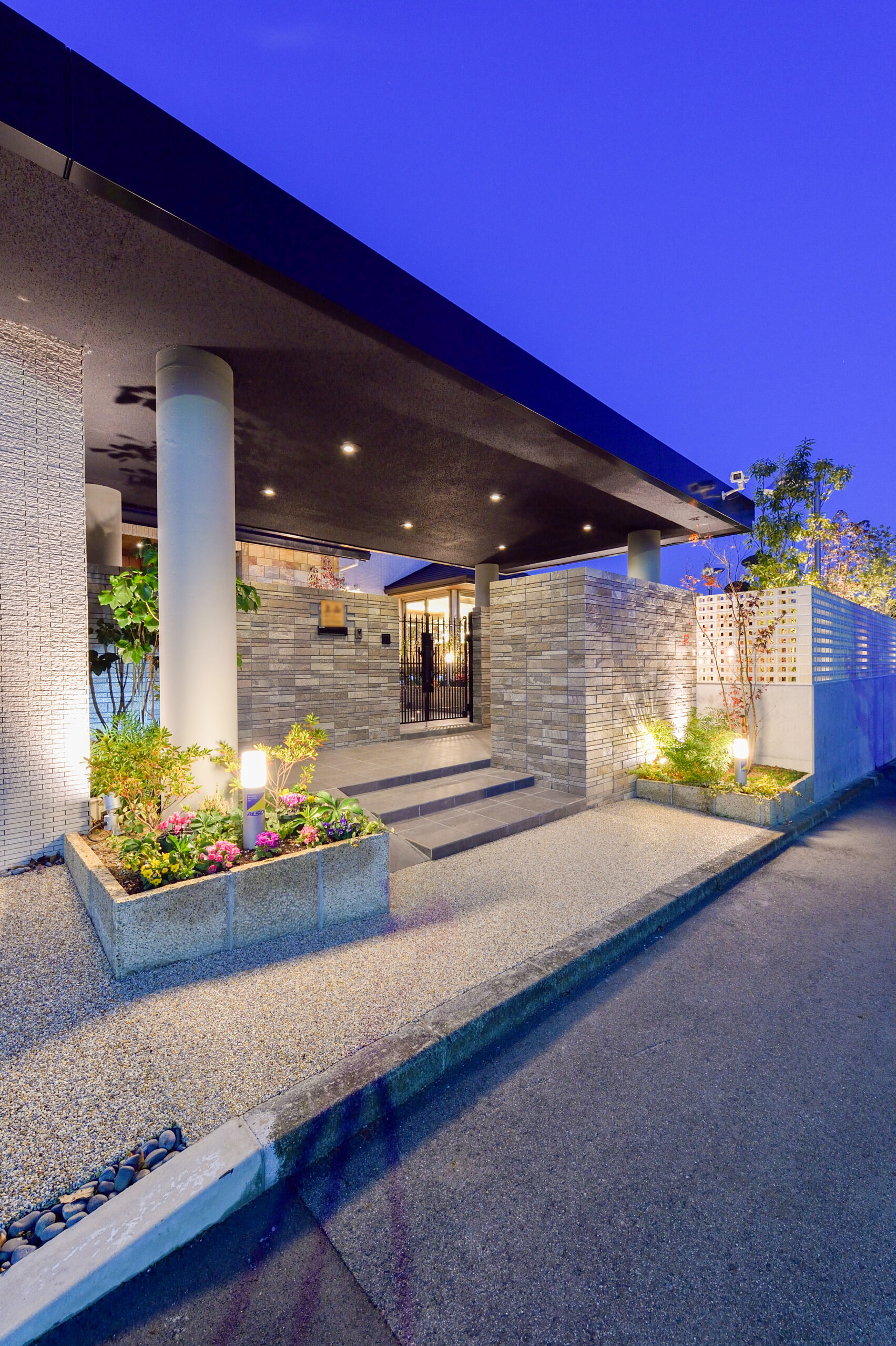 夜になると、アプローチから庭まで光が美しく連なり、建物全体が幻想的に浮かび上がります。