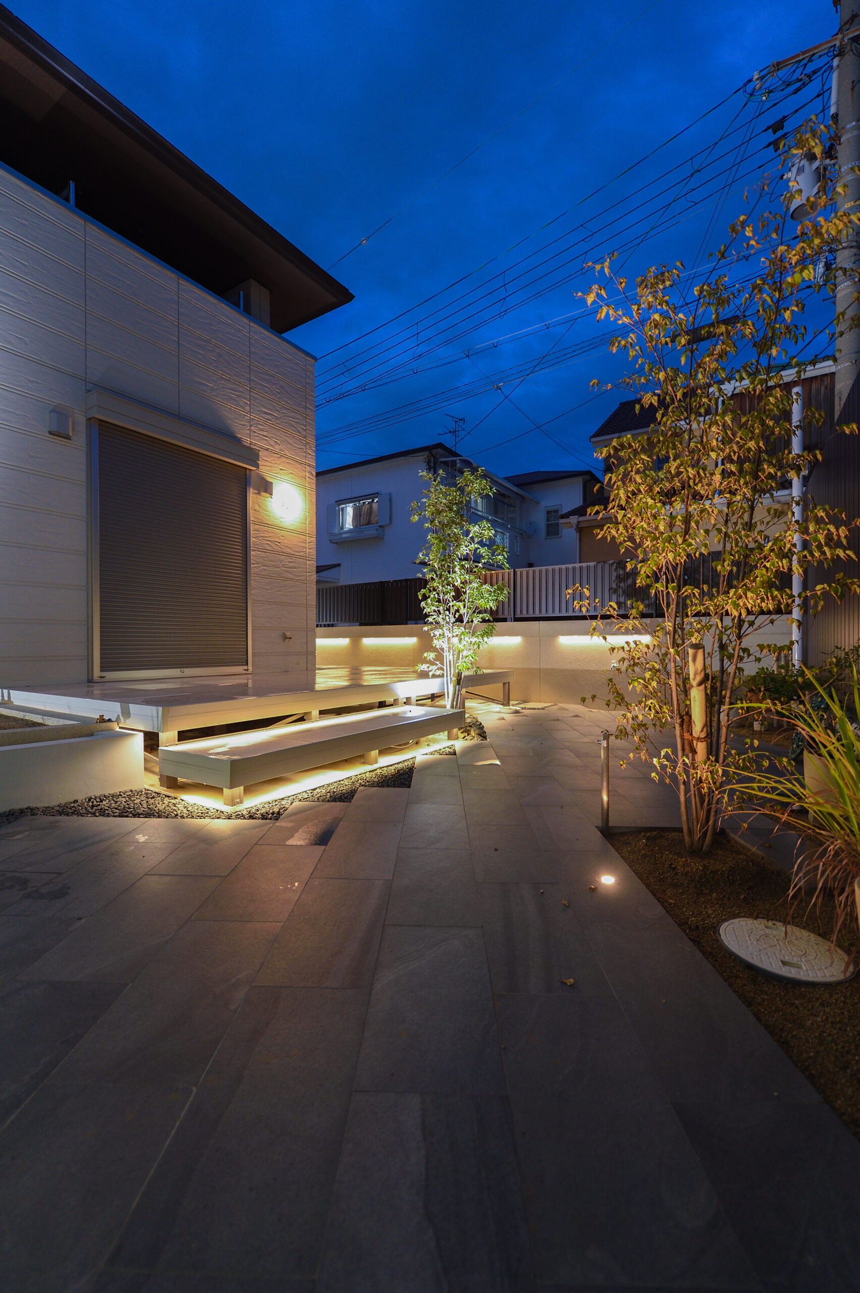 大判タイルテラスと植栽の陰影を活かしたライティングで、