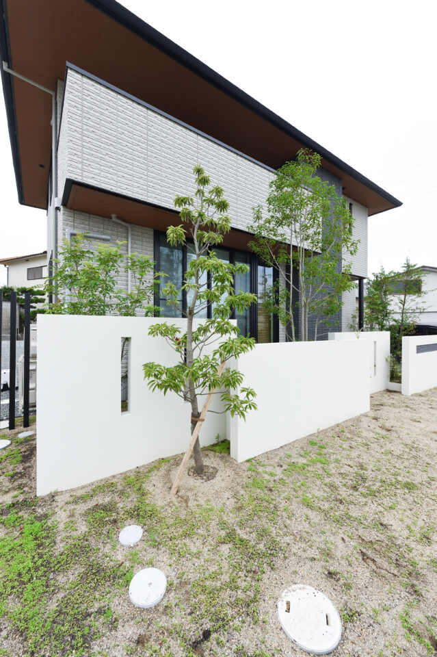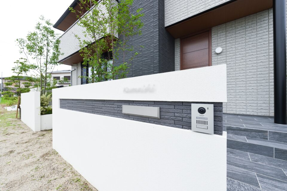 建物の外観デザインに合わせ、外構は白い門柱と黒のタイルを組み合わせたモダン外構に仕上げました。直線的でシンプルなラインを活かし、洗練された雰囲気を演出しています。白と黒のコントラストが際立ち、建物全体を引き立てる外構デザインです。