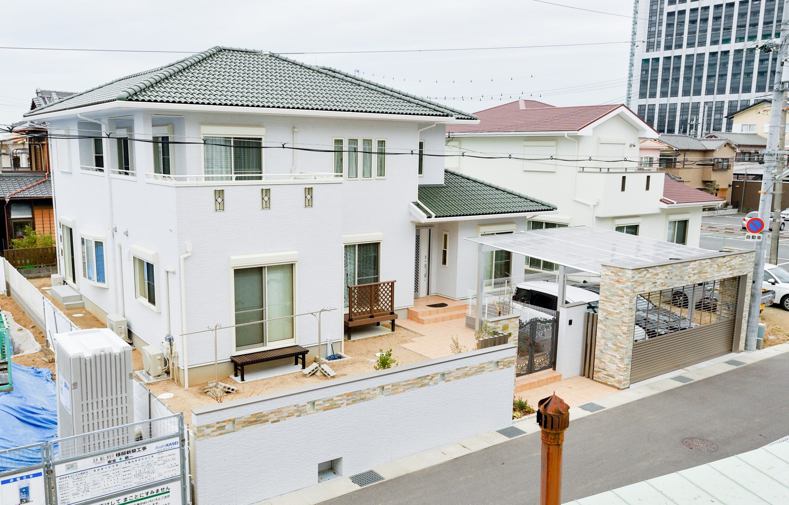 白を基調とした邸宅に合わせ、門まわりからカーポートまでを石張り調で統一。建物との一体感を演出しながら、高級感と防犯性を兼ね備えた外構デザインです。