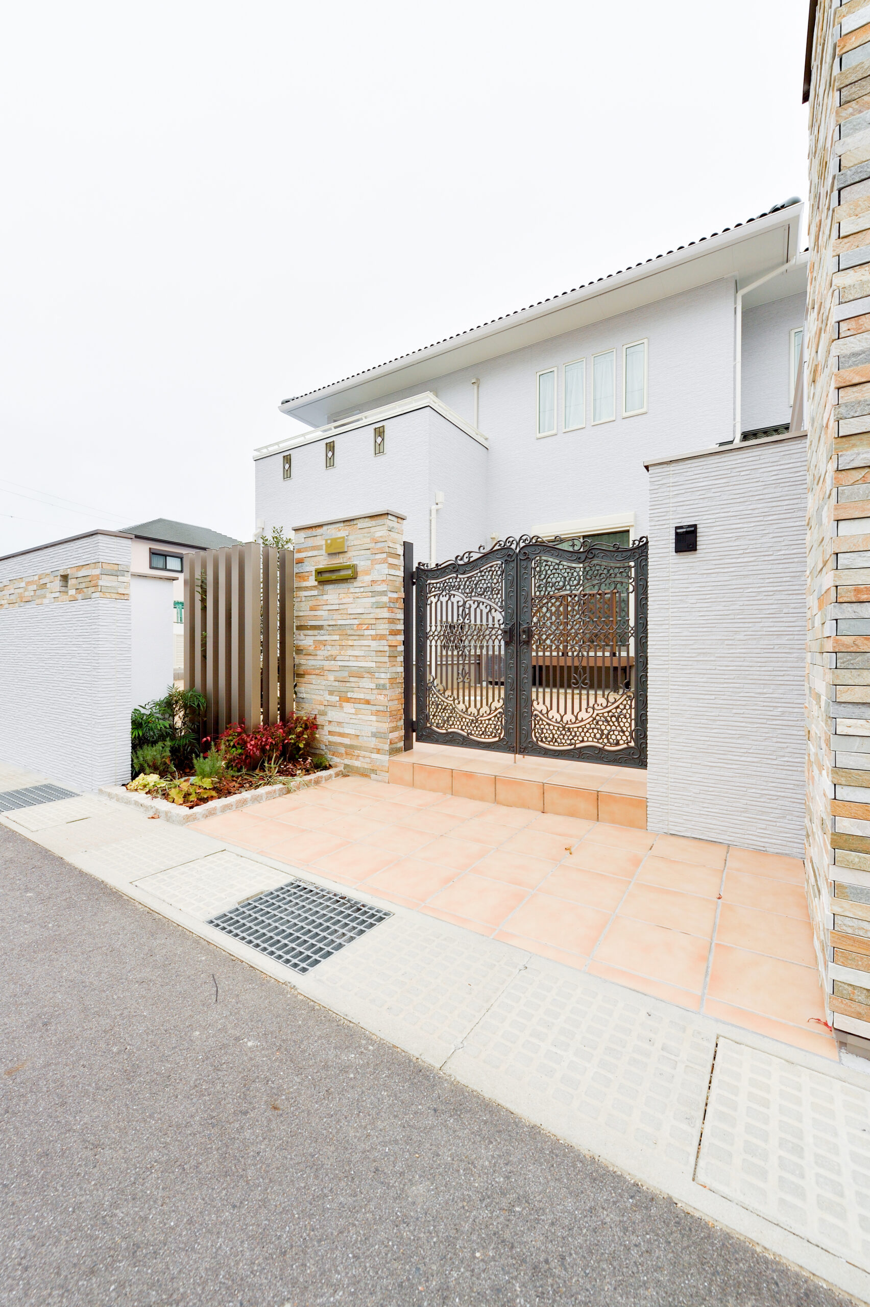 エントランスには鋳物門扉と石張り門柱を採用し、訪れる人を品よく迎え入れる重厚な雰囲気に仕上げました。表札・インターホン・ポストを機能的に配置し、見た目の美しさだけでなく実用性にも配慮しています。