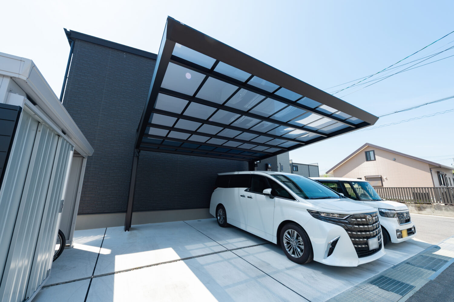 黒とグレーを基調にしたモダンなデザインでまとめられた外構空間は、