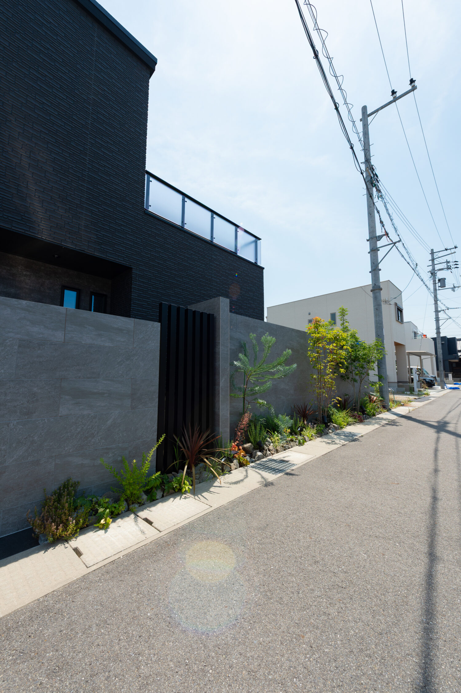 黒とグレーを基調に植栽が映えるモダン外構デザイン