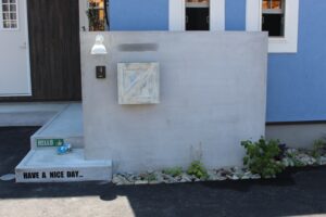 今回の施工事例では、シンプルながらも存在感のあるアプローチ階段を提案しました。階段の一段一段にこだわり、強調したデザインを施すことで、訪れる人々を温かく迎え入れる印象を与えています。ステップには、あえてシンプルなコンクリート素材を使用し、周囲には小さな石を配置して自然のエッセンスを加えました。階段の蹴上には「HELLO」「HAVE A NICE DAY」といった温かみのあるメッセージを添えて、楽しく開かれた空間を演出しています。
